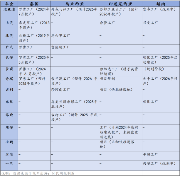 上汽、北汽福田、广汽、比亚迪、长安、长城等车企均已建立投产工厂,投产时间从2013年(上汽春武里工厂)跨度至2025年5月(长安罗勇工厂);马来西亚同样吸引了多家中国车企入驻,广汽、长城、北汽、吉利已在此建立并投产工厂;零跑、东风、奇瑞、比亚迪则跟进规划建厂;上汽、东风和江淮则已在越南实现了工厂投产。
