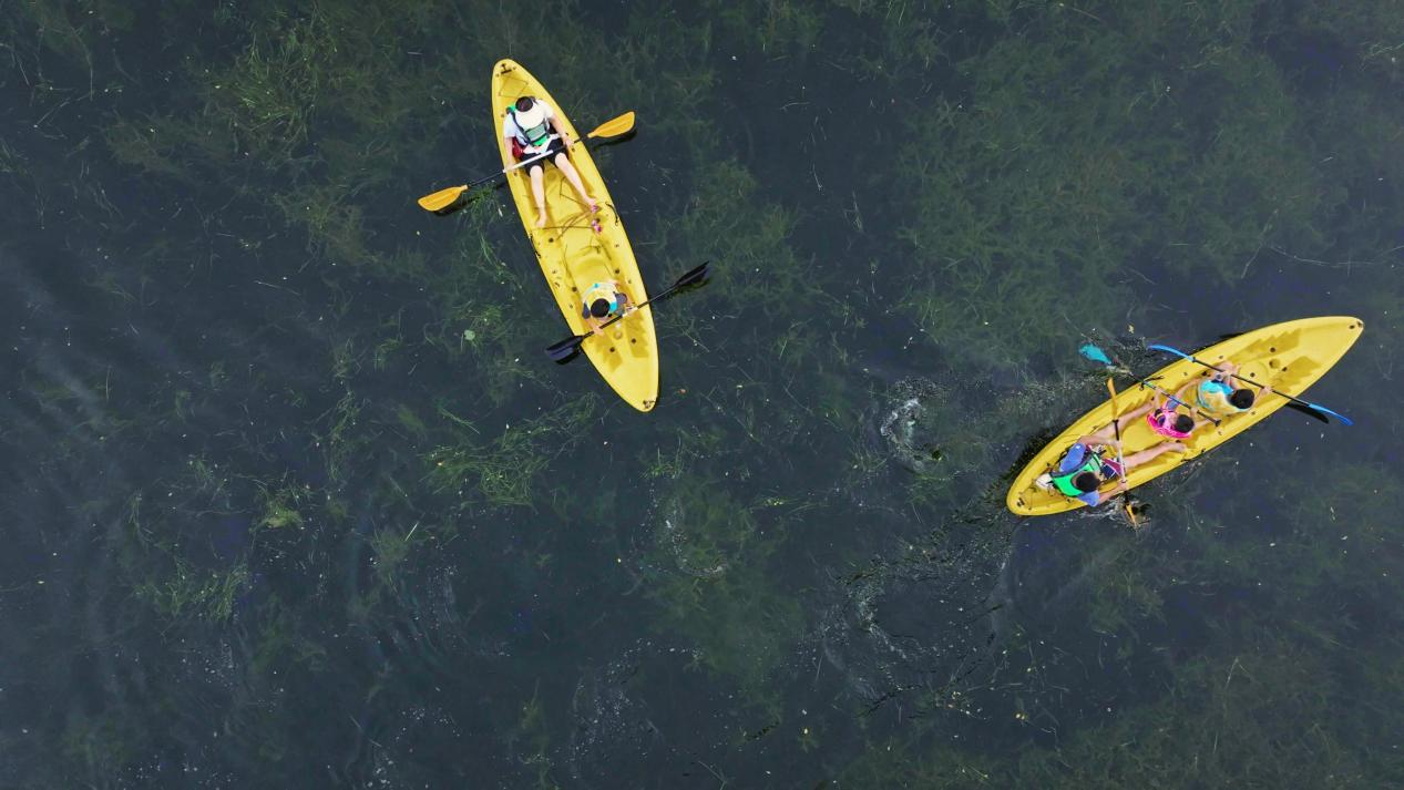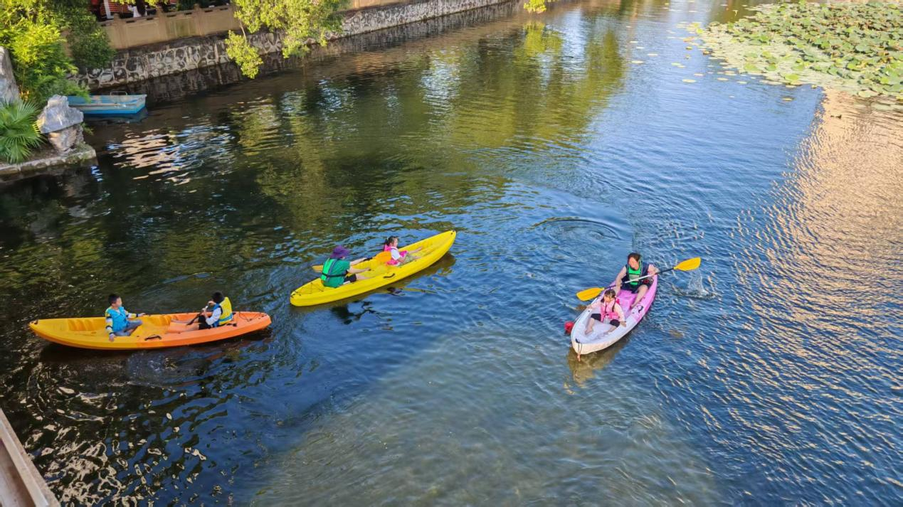 一场围绕小黄鸭的争夺赛暂停之际,两组家庭相视大笑,又开始互相较劲,各自蓄力,寻觅新目标。十几座皮划艇在水中或冲刺、或徜徉,孩子们的欢声笑语在湖面飘荡。