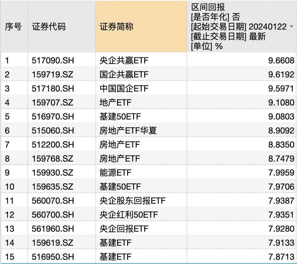 时代周报记者据Wind梳理股票型ETF,1月22日至1月26日收盘净值结算后,收益率靠前的ETF均为国央企、地产、基建、能源等相关产品;收益率前15位均为红利风格ETF,其中单周收益率最高的是央企共赢ETF,区间回报9.66%,国企共赢ETF(159719)及中国国企ETF(517180)位列第二、第三,分别斩获9.62%及9.60%的正收益。