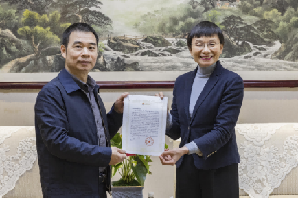 国家税务总局肇庆市税务局党委委员、副局长黎耀城为全国人大代表陈瑞爱(右)送上来自国家税务总局的感谢函,感谢她对税收工作提出的宝贵建议