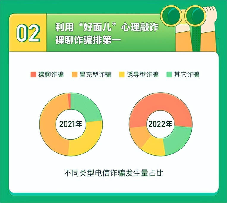 近日,360数科反诈实验室发布《2022年前三季度裸聊诈骗态势分析报告》(以下简称“报告”),数据显示:今年前三季度,裸聊诈骗发生量同比增长25倍,诈骗占比达53.69%,位居电信诈骗类型首位,九成以上受害者为40岁以下中青年男性,平均财损金额10685元。360数科反诈实验室认为,裸聊诈骗高频次发生的背后,除了色情灰产作祟,也与欺诈型诈骗被广泛打压后,骗子转而寻求更易得手的敲诈型诈骗有关。360数科反诈安全专家蒋志辰提醒,不下载来源不明的视频软件,不随意和陌生人视频通话,遭遇敲诈不要轻信骗子“花钱了事”的虚假承诺,及时止损报警。