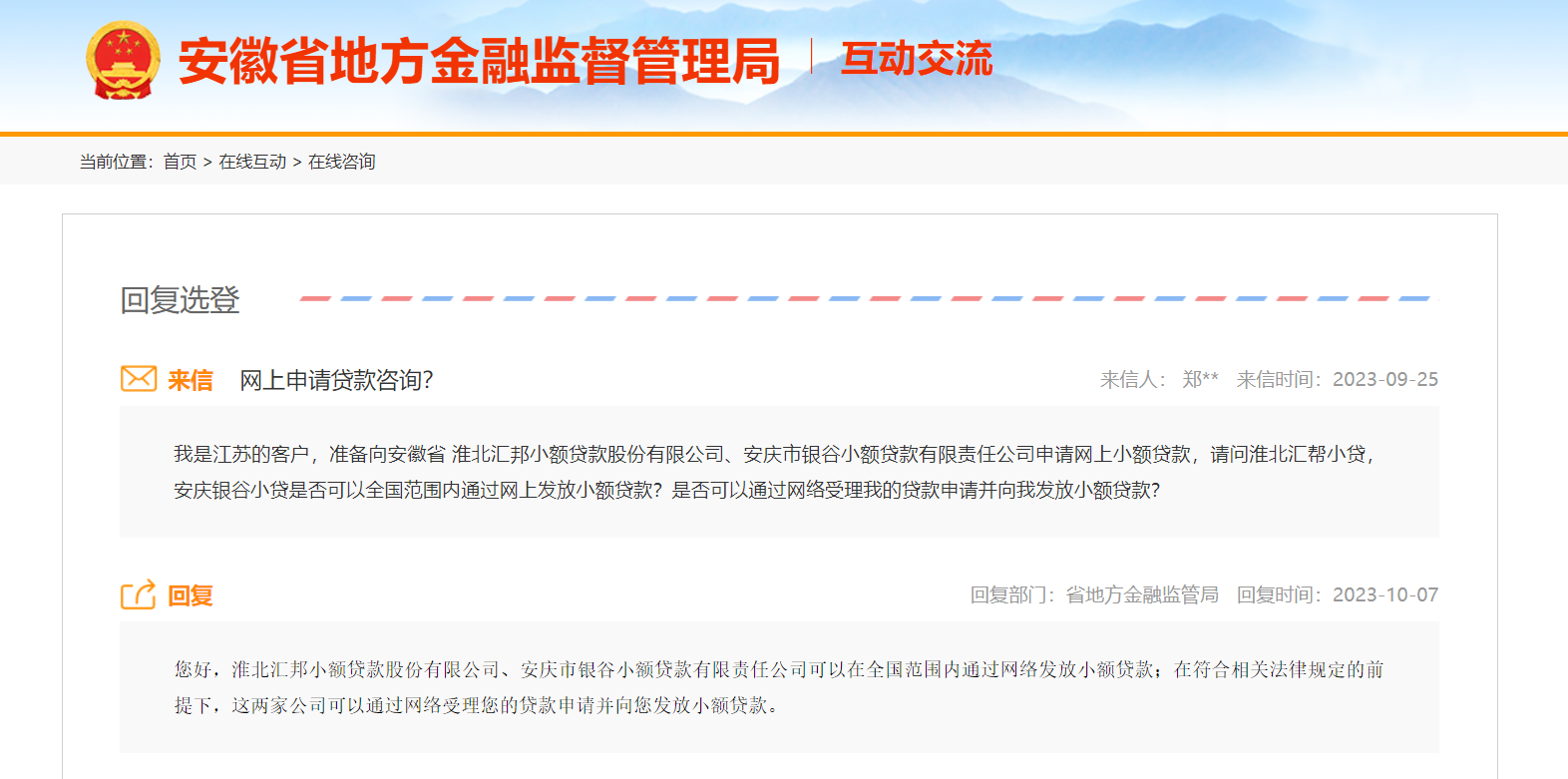 10月7日,安徽省地方金融监管局回复称,淮北汇邦小贷、安庆银谷小贷可以在全国范围内通过网络发放小额贷款;在符合相关法律规定的前提下,这两家公司可通过网络受理贷款申请,并发放小额贷款。