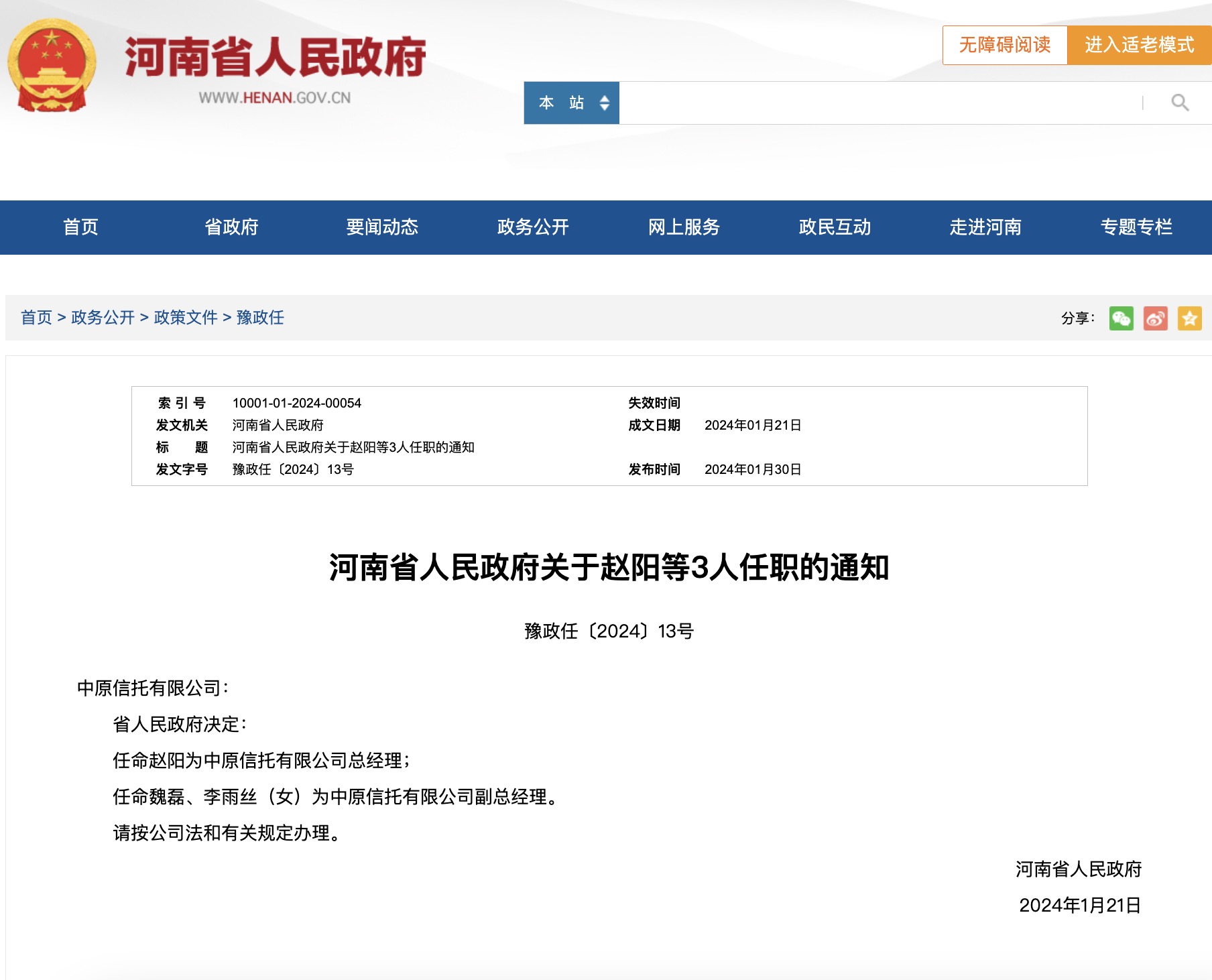 1月30日,河南省政府发布任职通知,省政府决定任命赵阳为中原信托总经理,任命魏磊、李雨丝(女)为中原信托副总经理。通知落款日期为1月21日。